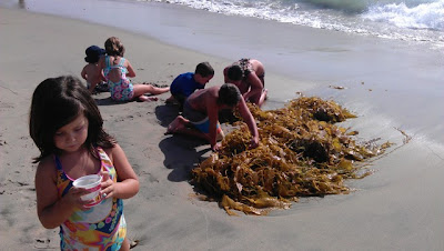The water had a lot of kelp in it today. I wonder if it has to do with recent storms elsewhere. There were several big batches of kelp like this floating off shore and drifting up on onto the beach.