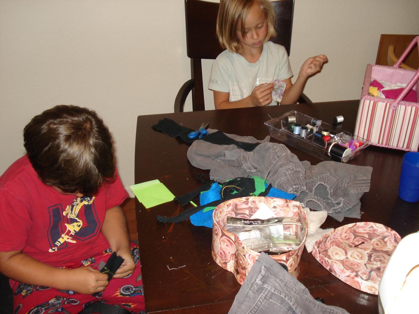 Knowing a bit about basic sewing, all I needed was the idea. So yesterday, I rummaged through some old clothes to see what we had and found a shirt for my youngest and some old jeans for my boy. My oldest daughter picked an old dress she loved and off I went on my latest preoccupation.