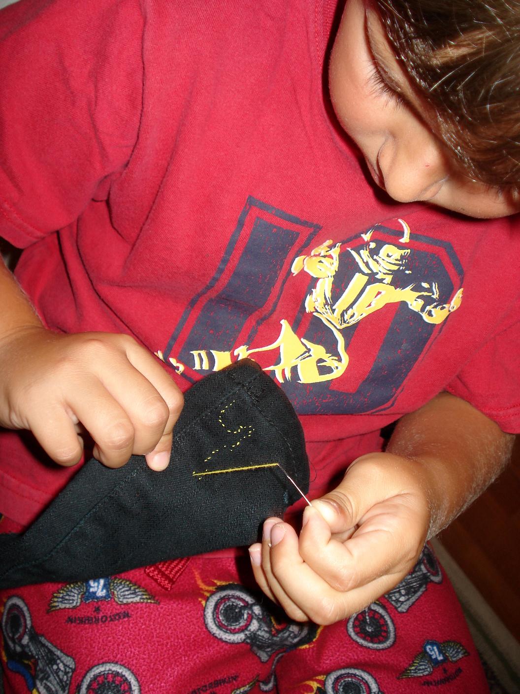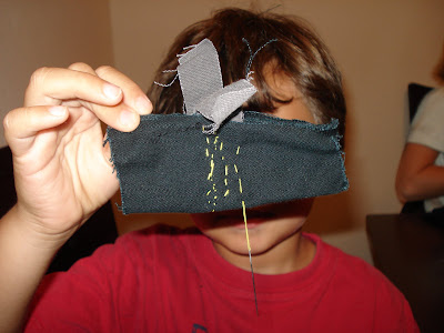 Anyhow, I spent the most part of the day making those bags. Having shown the kids how to do a basic embroidery stitch a while ago, they took scraps and thread and needle and started working on their own stitching. They threaded their own needles and I tied a knot in the end for them.