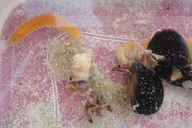 worm and mussel with its foot out