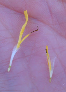 Here’s a closer look at the dandelion’s outer vs. inner flowers. You can see the one on the left is more mature. In both, you can see the ovary at the bottom where the seed will come from.