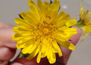 Here’s a closer look at the dandelion’s outer vs. inner flowers. You can see the one on the left is more mature. In both, you can see the ovary at the bottom where the seed will come from.